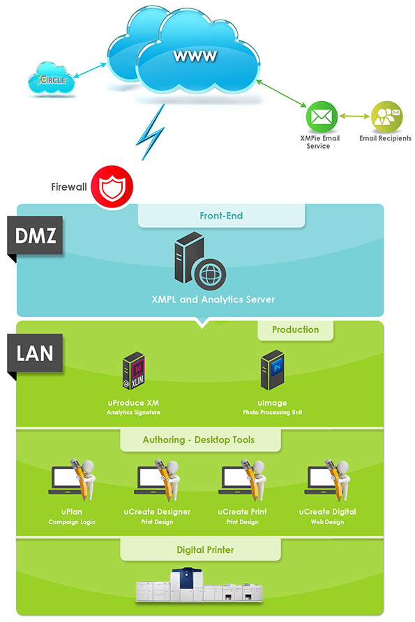 uProduce is server-based software for binding the logic, data, and design to create personalized print documents, emails or websites, and for processing them, as needed. uProduce serves as a back-end production engine whereas the production is managed via Circle user interface. For more information on uProduce, see uProduce setup and monitoring.