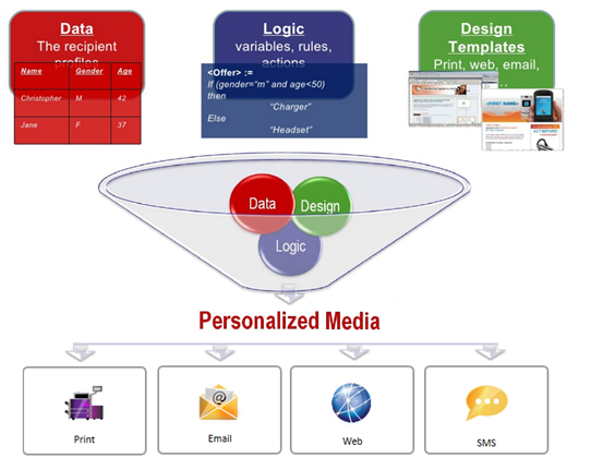 The PersonalEffect personalization is based on the concept of binding Design, Data and Logic to produce multichannel campaigns.