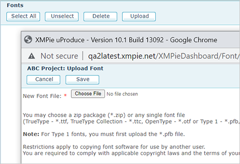 Note: You can also upload fonts bundled in a .cpkg file from uCreate Print. A .cpkg file can be uploaded only from the Get Started: Choose an Option wizard. See Uploading a campaign package.