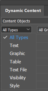 Wenn Sie das Dokument zum ersten Mal mit einer Datenquelle verknüpfen, erstellt uCreate Print automatisch ein ADOR für jede Spaltenüberschrift in der Datenquelle. Diese ADORs werden im Bereich „Dynamischer Inhalt“ angezeigt. Standardmäßig ist der Typ aller neuen ADORs Text. Sie können die Liste der ADORs nach Art filtern: