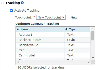 If you have not configured tracking yet, or wish to edit the Track ADOR Values list, click the Configure Campaign Tracking link and set up the Configure Campaign Tracked ADORs window.