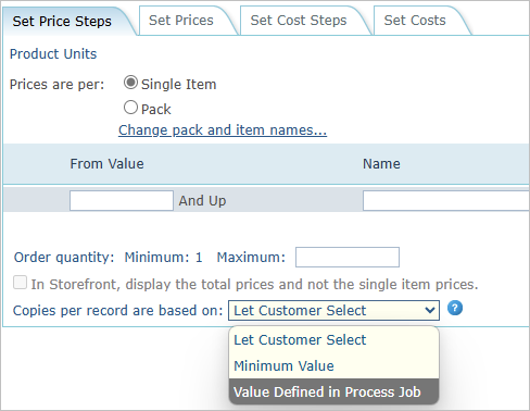 Dynamische Produkte können die Anzahl der Kopien aus dem in der uProduce-Verarbeitungsaufgabe definierten Wert übernehmen. Dies wird unter Einrichtung der Produktpreise > Preisstufen festlegen > Kopien pro Datensatz basieren auf > In Verarbeitungsaufgabe definierter Wert eingestellt.