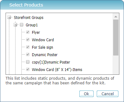 Gelistet werden statische Produkte und dynamische Produkte derselben Kampagne, die für das Kit definiert wurde. Produkte, die in verborgenen Gruppen aufgelistet sind, werden auch angezeigt.