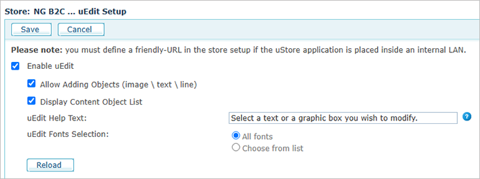 Auf dieser Seite können Sie uEdit aktivieren oder deaktivieren und die uEdit-Einstellungen definieren, die den Kunden im Shop zur Verfügung stehen und es ihnen ermöglichen, ihr Dokument und seine Objekte (Text- und Grafikfelder) mit klaren, intuitiven Werkzeugen zu bearbeiten.