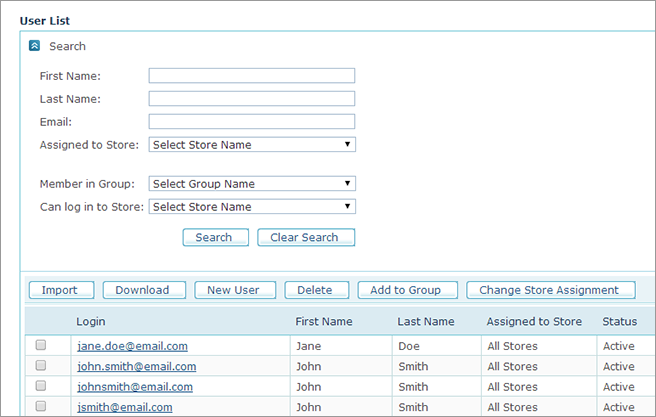 Wählen Sie im Feld Hinzufügen zur Gruppedie Benutzergruppe, zu der Sie die importierten Benutzer hinzufügen möchten. Dieser Schritt ist obligatorisch: Benutzer können keine Berechtigungen in der Anwendung erhalten, wenn Sie nicht Mitglied einer bestimmten Benutzergruppe werden. Vergewissern Sie sich, dass die gewählte Benutzergruppe die Erlaubnis für den Zugang zum zugewiesenen Shop hat.