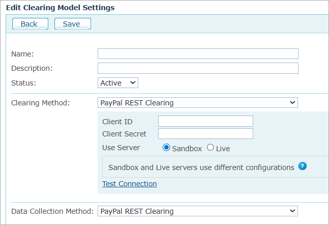 Select Live to use the production server. Select Sandbox to use the test server. |