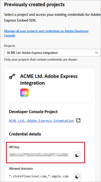 At the end of the process you will have an API key that you can copy and use in your uStore widget. A project in Adobe Developer Console will also be created.
