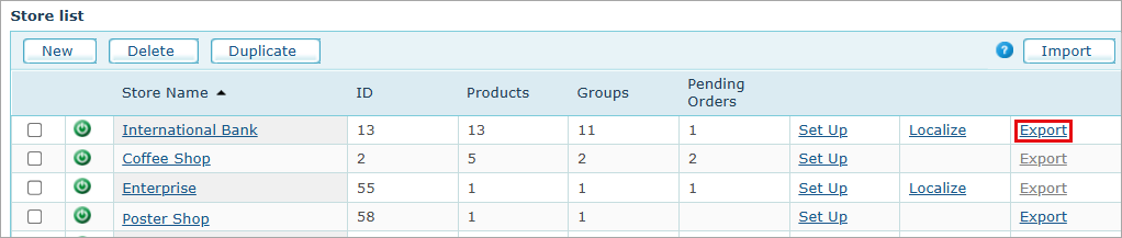 In the Stores page, select the store whose configuration you wish to use in a new store, and in the right-most column click Export.