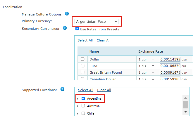 Dans l'exemple ci-dessus, le même module est utilisé pour l'Argentine et le Chili. La différence réside dans la devise principale, qui est définie dans Configuration du magasin > Onglet Apparence. Pour ce qui est du Chili, il faut définir le peso chilien comme devise et le Chili comme destination possible, tandis que pour l'Argentine , la devise est le peso argentin, et l'Argentine doit être paramétrée comme destination possible.
