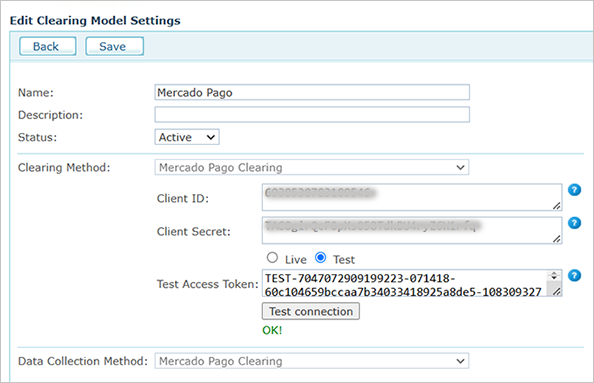 En direct ou Test : Si vous souhaitez d'abord tester le processus de paiement, sélectionnez Test et saisissez le jeton d'accès de test fourni par Mercado Pago. Pour tout ce qui est production, sélectionnez l’option En ligne.