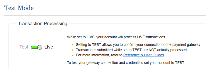 Sélectionnez Test pour utiliser la passerelle de paiement du compte Sandbox Authorize.Net. (Le compte sera « Live [actif] » dans les paramètres du compte Authorize.Net, en mode Test.)
