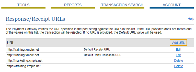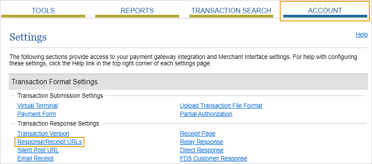 Cliquez sur l’onglet Compte, puis sélectionnez URL de réponse/reçu.