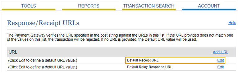 Sur la page URL de réponse/reçu, cliquez sur Modifier pour définir la valeur d’URL de l’URL de réception par défaut.