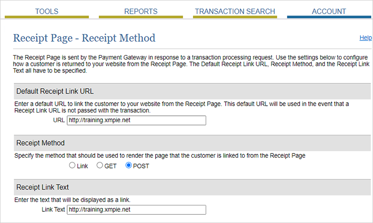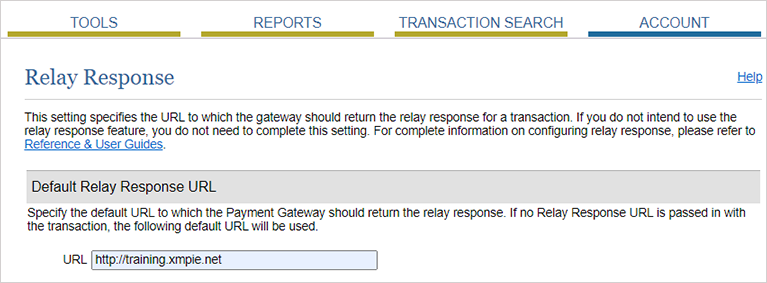Cliquez sur l’onglet Compte et accédez de nouveau à la page URL de réponse/reçu pour définir l'URL de réponse du relais.