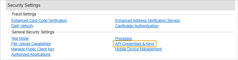 Ces informations sont disponibles depuis l'interface Authorize.Net : sélectionnez Compte > Informations d'identification et clés API (dans Paramètres de sécurité > Paramètres de sécurité généraux).