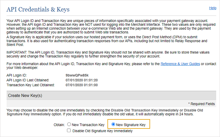 Ces informations vous ont été données lors de la configuration de votre compte. Si nécessaire, créez une nouvelle clé sur l'interface Authorize.Net. Accédez à Compte > Informations d'identification et clés API (dans Paramètres de sécurité > Paramètres de sécurité généraux), puis utilisez la section Créer une nouvelle clé.