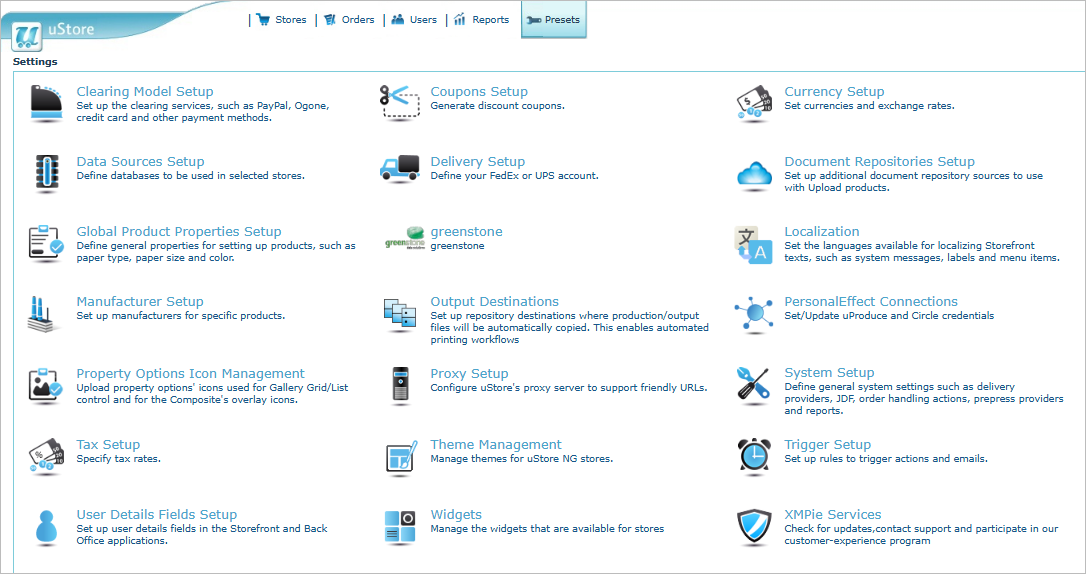 La zone Outils dans uStore est votre point de départ pour les paramètres globaux de votre magasin et pour le paramétrage du système. A partir des Outils , les administrateurs peuvent accéder à divers paramètres globaux et aux tables de base de données logicielles pour contrôler le comportement du centre commercial et l'expérience d'achat en magasin.