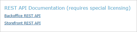 La zone de documentation de l'API REST contient des liens vers la documentation de l'API REST du BackOffice et du Storefront. Vous devez acquérir une licence pour utiliser ces API.