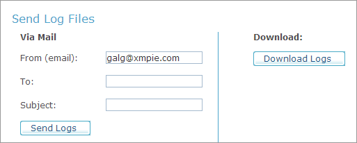 Par e-mail : Envoie les fichiers journaux à un destinataire spécifique via e-mail. Entrez le De (e-mail), et les champs Pour et Subject (Sujet) et cliquez sur Envoyer les fichiers journaux.