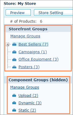 La page Détail s du magasin liste à la fois les groupes du Storefront et les groupes de composants par ordre hiérarchique. Vous pouvez sélectionner un groupe spécifique pour afficher et gérer les produits qu’il contient.