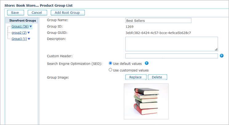Dans le champ Nom du groupe, inscrivez un nom explicite qui indique le type de produit que contiendra le groupe (par exemple, « Livres à succès »). Le nom du groupe de produits sera affiché dans le Storefront. Les noms des groupes ou des sous-groupes de la même hiérarchie doivent être uniques.