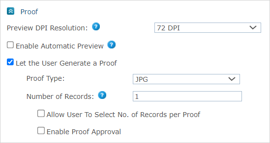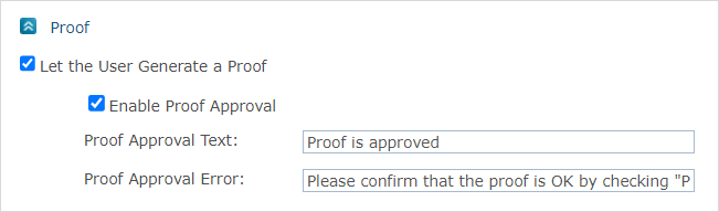 Cochez la case Permettre l’approbation de l’épreuve pour permettre aux clients d’approuver une épreuve de document avant de soumettre un bon de commande. Vous pouvez modifier le texte utilisé pour l’approbation du client dans le champ Texte d’approbation et le texte utilisé quand un document d’épreuve a échoué dans la case Erreur d’approbation.