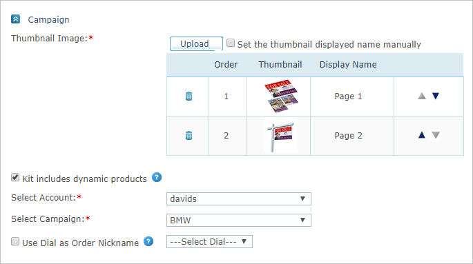 Si vous souhaitez inclure des produits dynamiques dans un kit, sélectionnez l’option Kit inclut des produits dynamiques, puis sélectionnez un compte uProduce et une campagne. Vous ne pourrez ajouter à ce kit que des composants dynamiques faisant partie de la campagne sélectionnée.