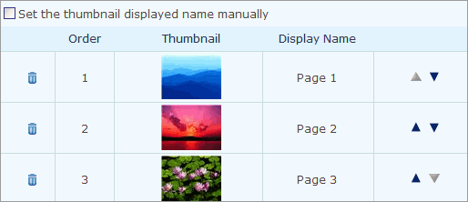 Le nom par défaut pour les vignettes téléchargées est « Page [numéro de la page] ». Si vous voulez renommer les images des produits téléchargés, cochez la caseParamétrez manuellement le nom de vignette à afficher au-dessus du tableau. Une fois cette option sélectionnée, la colonne Nom d’affichage se transforme en zone de texte et vous pouvez la modifier.