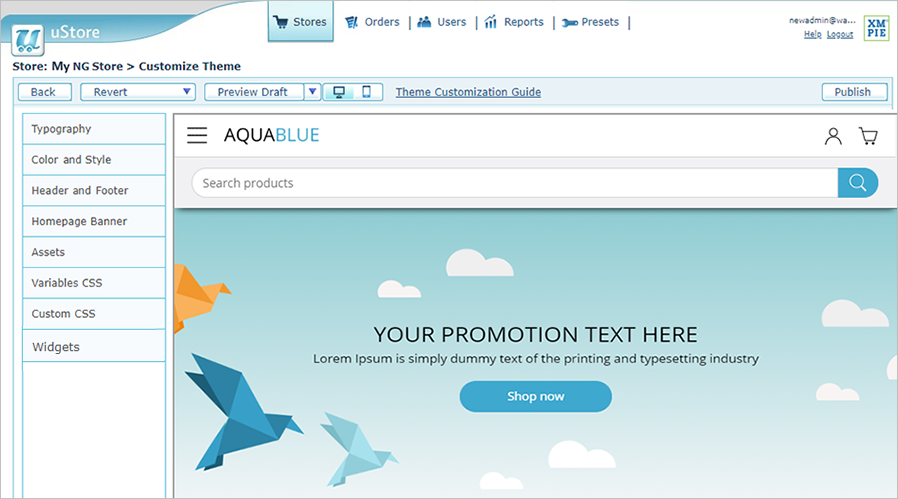 uStore NG est livré avec un thème prêt à l'emploi spécialement conçu pour vos magasins en ligne. Personnaliser un thème pour l'adapter au mieux aux consignes de votre entreprise pour la promotion de la marque peut être réalisé en quelques secondes à l'aide de l'éditeur de thèmes WYSIWYG, sans qu'il soit nécessaire de modifier le code.